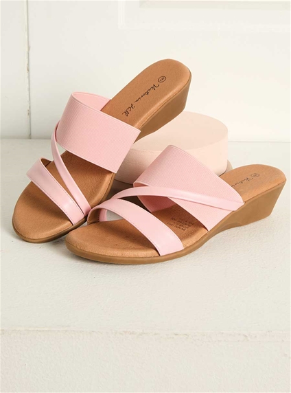 Timelessly elegant, these slip on sandals feature padded soles and an elastic band over the foot for added comfort. Heel height 4.5cm. PU Upper, Leather Sock.