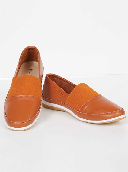 A lovely leather shoe with a matching stretch elastic panel for comfort of wear. A contrasting and comfortable sole. Leather upper, leather sock, balance man made materials.