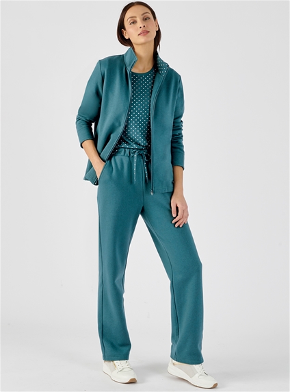 You will love this amazing 3 piece tracksuit! Featuring a jacket with zip front and front pockets with contrast polka dot trim inside the collar. Full length pants with tie front and elastic waist for a comfortable fit and 2 side pockets. Crew neck printed tee featuring a lovely polka dot design. 65% Polyester, 35% Cotton.