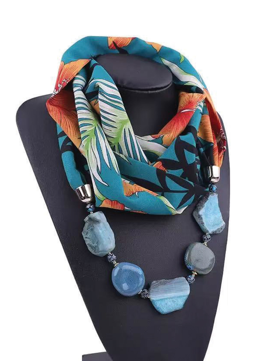 Add a vibrant touch to your wardrobe with our Tropical Print Beaded Scarf Necklace. Perfect for every occasion, this versatile accessory combines the elegance of a scarf with the charm of a statement necklace. Featuring a beautiful tropical print in bold colours, it’s a fresh, fun way to elevate your outfit. Crafted from a high-quality blend of 90% polyester and 10% acrylic, this scarf offers a soft, breathable feel, while the chic beaded accents give it an eye-catching sparkle. Whether you're dressing up for a night out or adding a pop of color to a casual look, this scarf necklace is your go-to accessory.