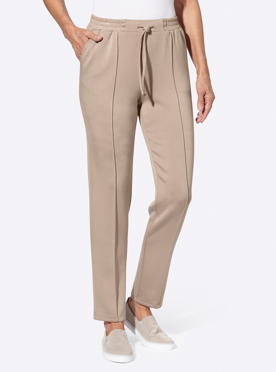 So soft and supple, you have to feel it for yourself! Comfortable slip-on trousers with an all-round stretch waistband and decorative ribbon on the smooth front. Fits very well thanks to the fitted darts at the back. Length: 100cm-104cm. 55% Viscose, 40% Polyester, 5% Elastane.