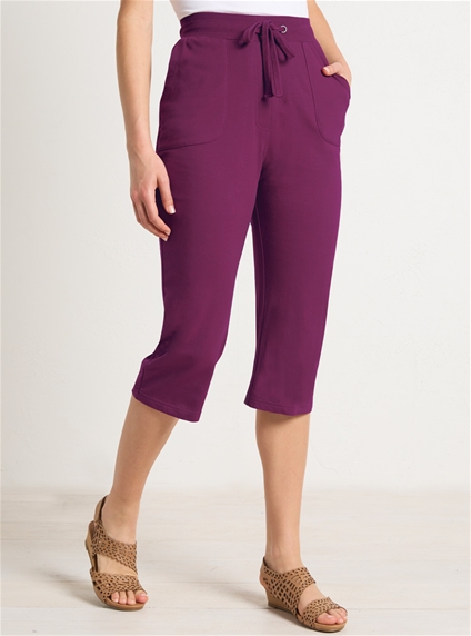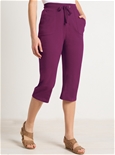 Crop length casual pants with side pockets. Rib elastic waist with drawstring and rivets. 100% Cotton