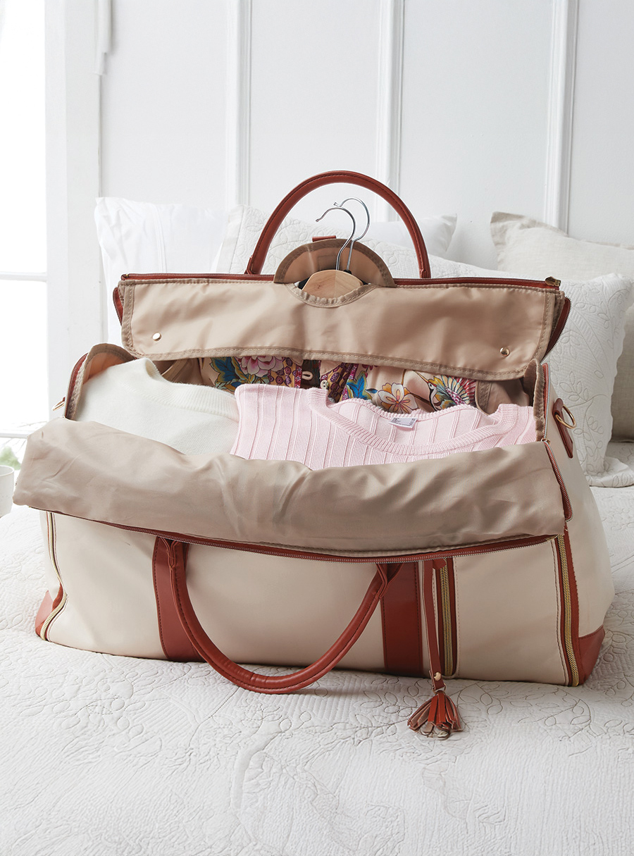 This ingenious bag opens up like a full-length garment carrier to keep your coats, suits and dresses flat while you travel and dust-free when you hang them up at your destination. It also zips into shape as a regular 52L x 31.75W x 22.5D cm duffle, with plenty of room for your other travel essentials. Made from tough, easyclean PU, it’s available in a choice of cream or black, both with a rich tan trim.