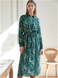 In a flattering silhouette, this dress features a beautiful all over print. A shirt collar and short button placket. A tie waist for shape and button cuffs on the ends of the long sleeves. 100% Viscose.