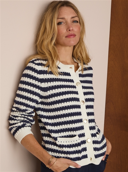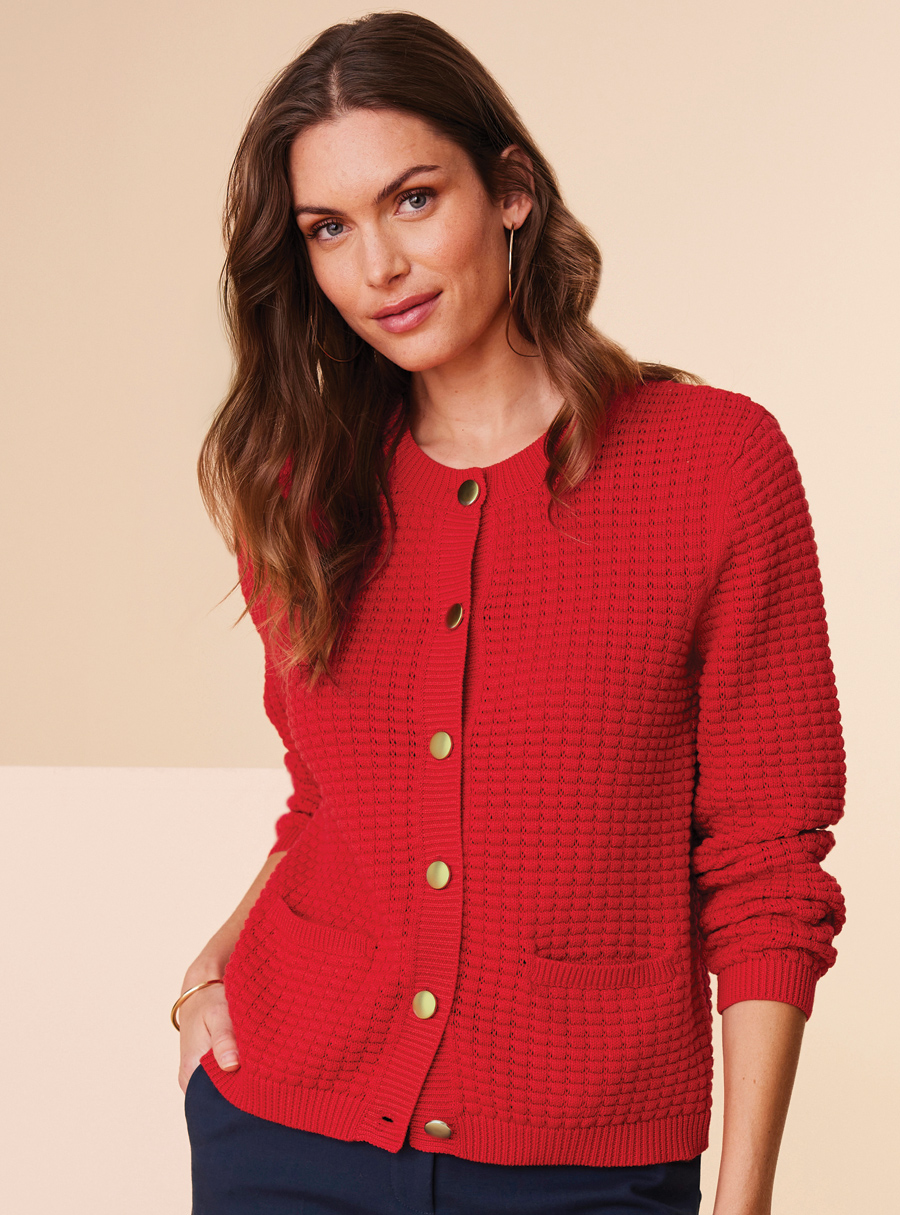 Cotton textured cardigan with front pockets and metal buttons. 100% Cotton.