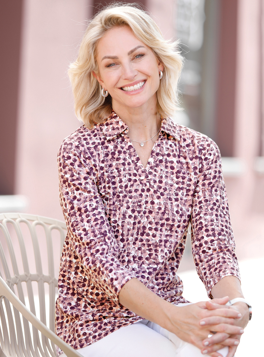 Polo shirt – the graphic pattern can be combined in many different ways! Open polo collar, 3/4 sleeves. Comfortable cotton quality. 100% Cotton.