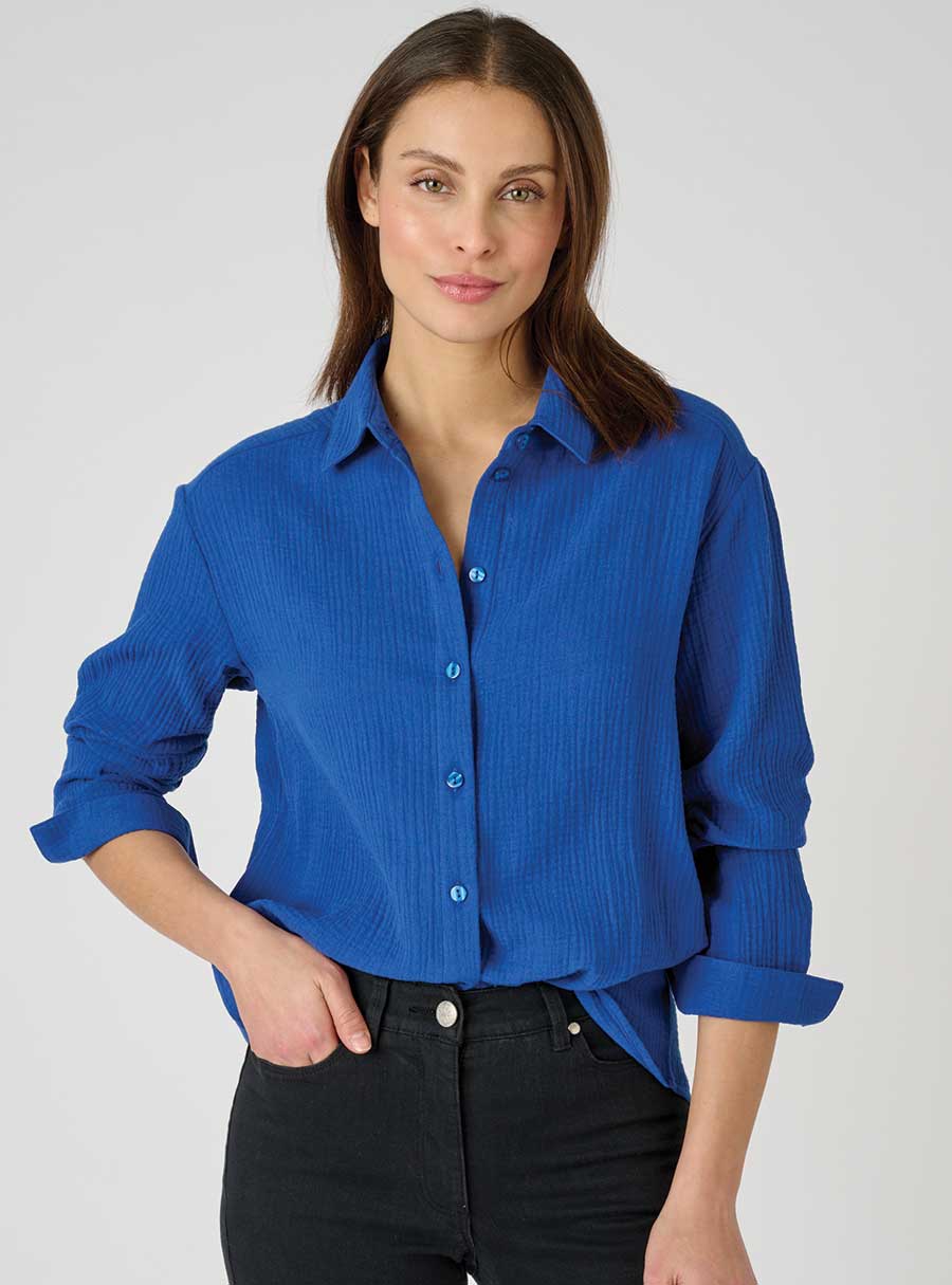This ladies blouse has long sleeves with tab-back button fastening so you can wear the sleeves elbow length too. Pure cotton for cool comfort. 100% Cotton.