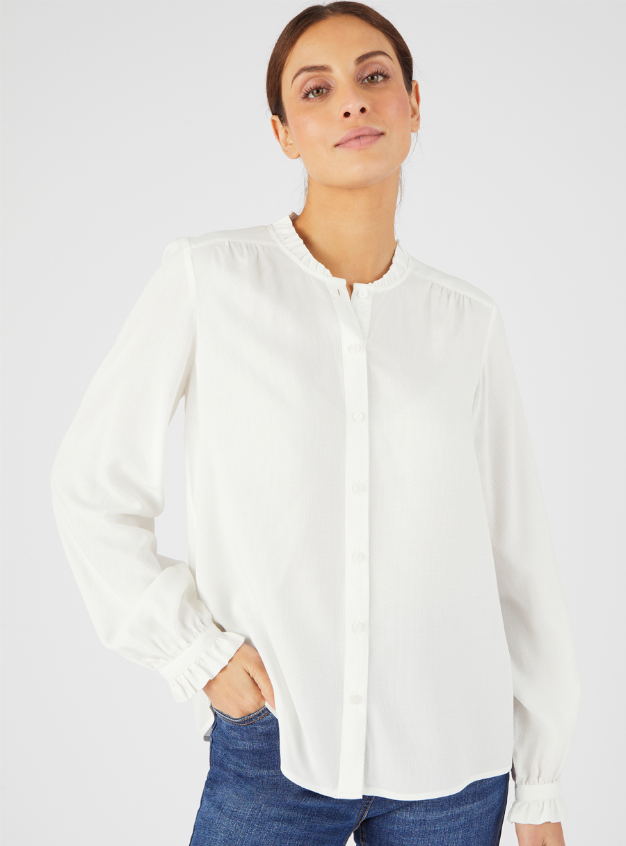 A simple yet elegant blouse that is sure to be a wardrobe staple. A round neckline with shirring on the shoulders for a stylish touch. Elastic cuffs on the long sleeves and a long front button placket. 100% Viscose.