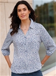 This 3/4-sleeve blouse features an all-over floral print and supple viscose fabric. Shirt collar with an open V-neckline and short button placket. Chest darts ensure a perfect fit. Elasticated cuffs on the 3/4-length sleeves and hem. 100% Viscose.