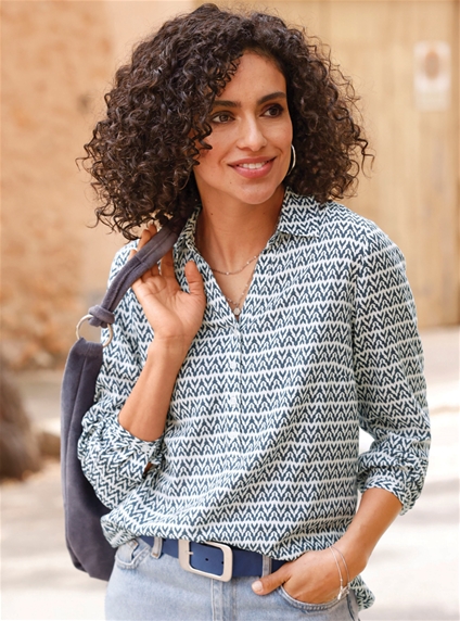 Print blouse in a two-tone design and soft, supple fabric. In a slip-on style with an open shirt collar and short button placket. Wide pleat at the back yoke. Narrow button cuff at the end of the long sleeves. Slightly rounded hem. 100% Viscose.