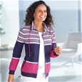 A fashionable and long line stripe sweater. Round neckline and long sleeves with a flattering silhouette. Pair with trousers for a stylish look or a skirt for elegance. 59% Acrylic, 41% Cotton.