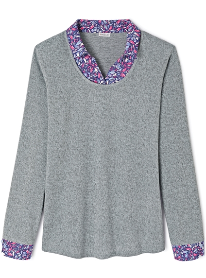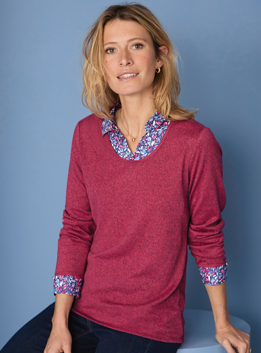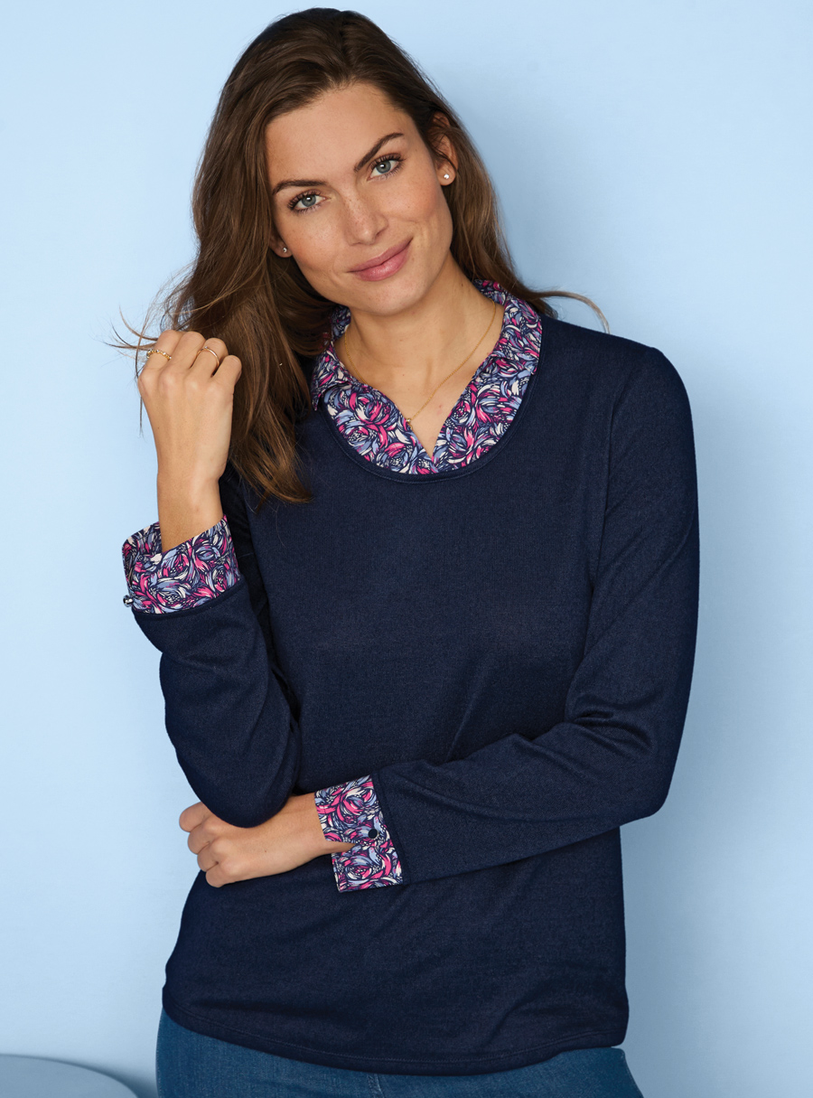 Easy to wear 2 in 1 polo sweater, with woven printed collar and cuffs. Wear it with denim or dress it up with your favourite tailored pant. 95% Polyester, 5% Elastane.