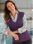 Elaborately knitted vest with a mix of purl knit, cable and diamond patterns. The back is knitted in plain knit. Stretch V-neck and ribbed hem. 50% Acrylic, 50% Cotton.