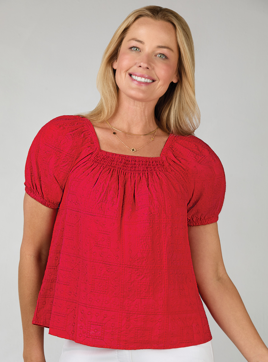 Soft and breathable in 100% cotton, this embroidered top features a smocked neckline and gently puffed sleeves for an easy, feminine silhouette. Perfect for pairing with skirts or pants for versatile everyday style. 100% Cotton.